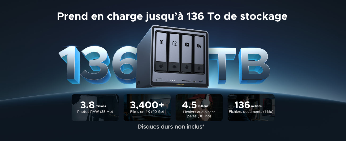 | Capacité de stockage max. | 136 To (4x 30 To + 2x 8 To) |