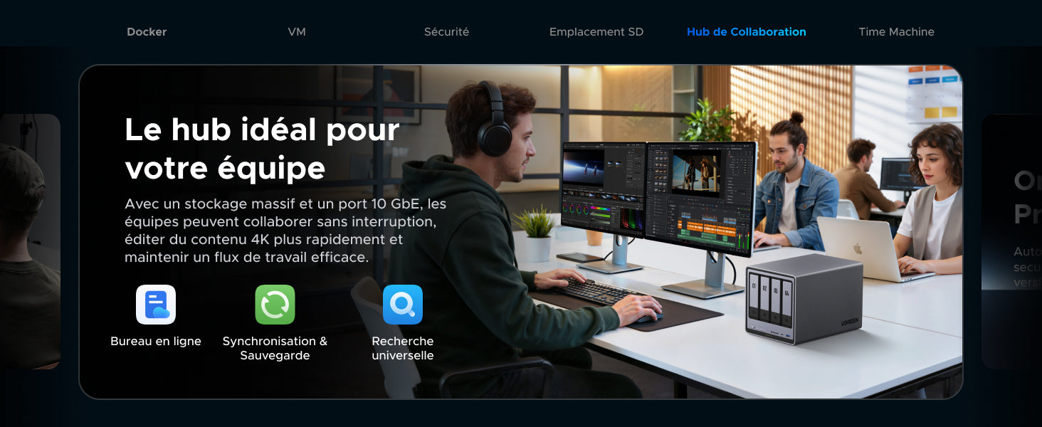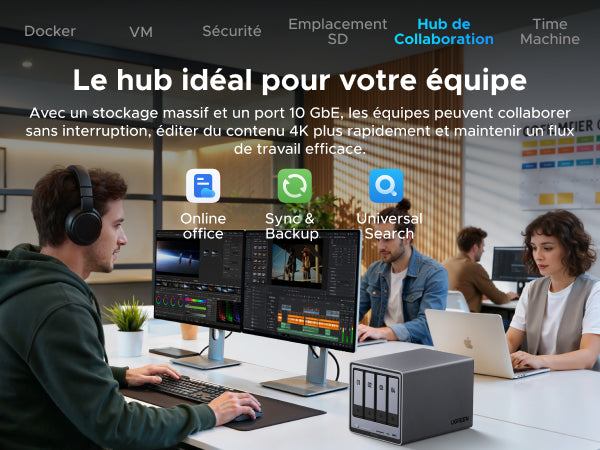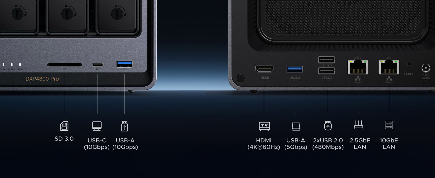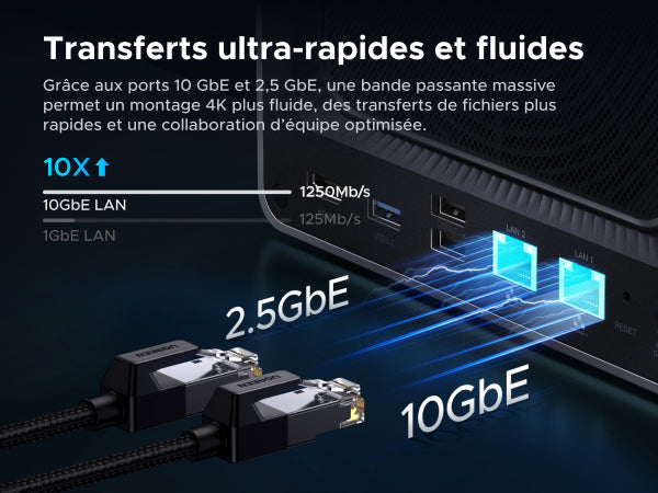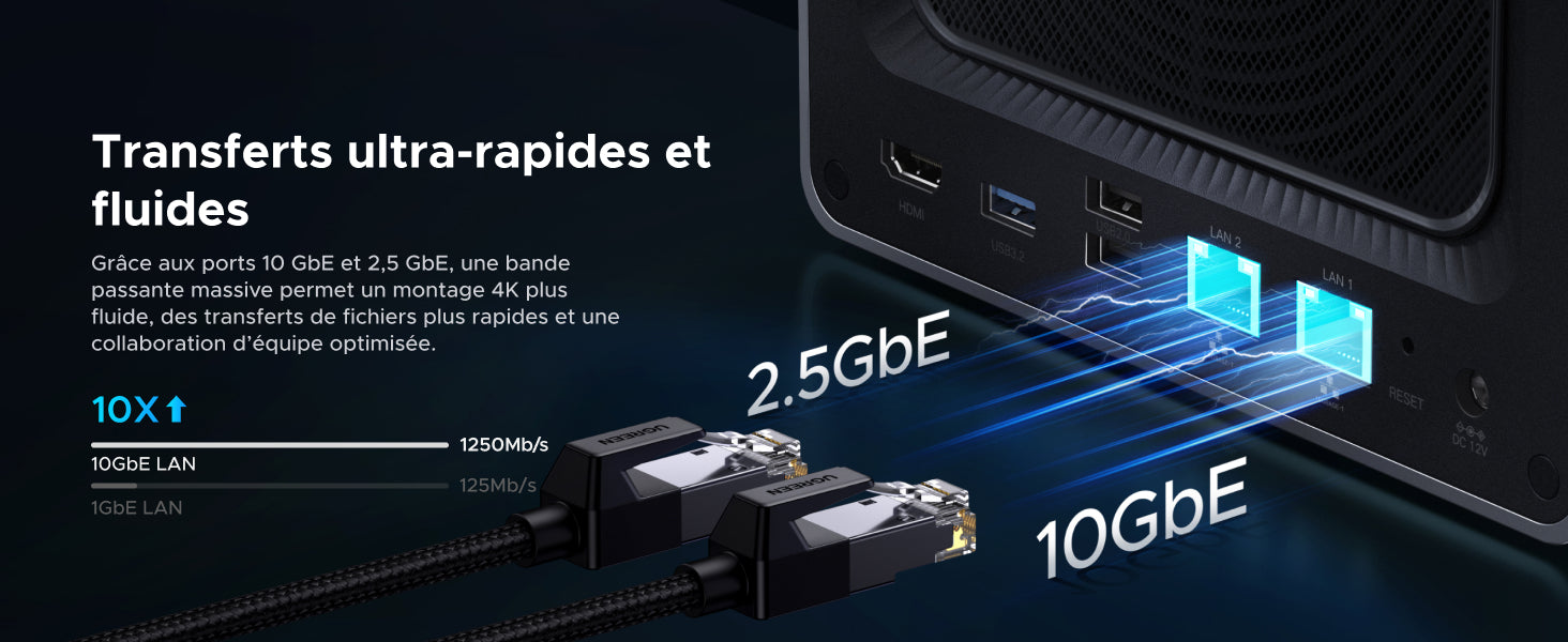 - Connectivité réseau 10 GbE + 2,5 GbE : Le port 10 GbE permet des transferts jusqu'à 1,25 Go/s. Le port 2,5 GbE offre quant à lui une compatibilité descendante avec les routeurs et appareils courants.