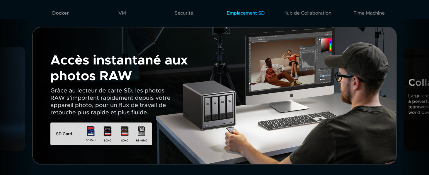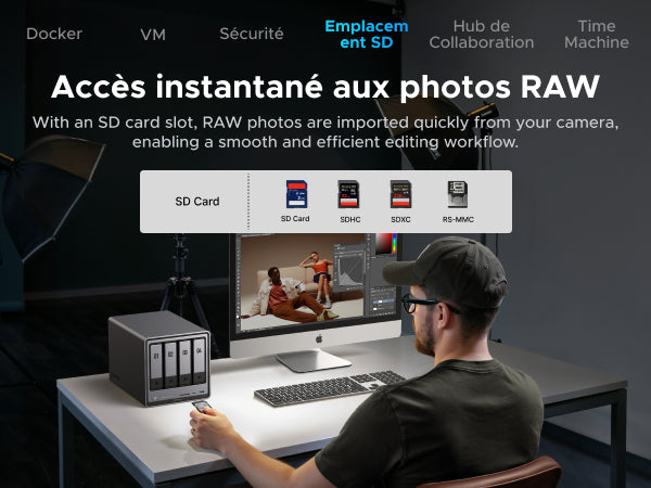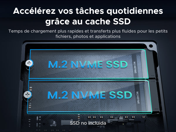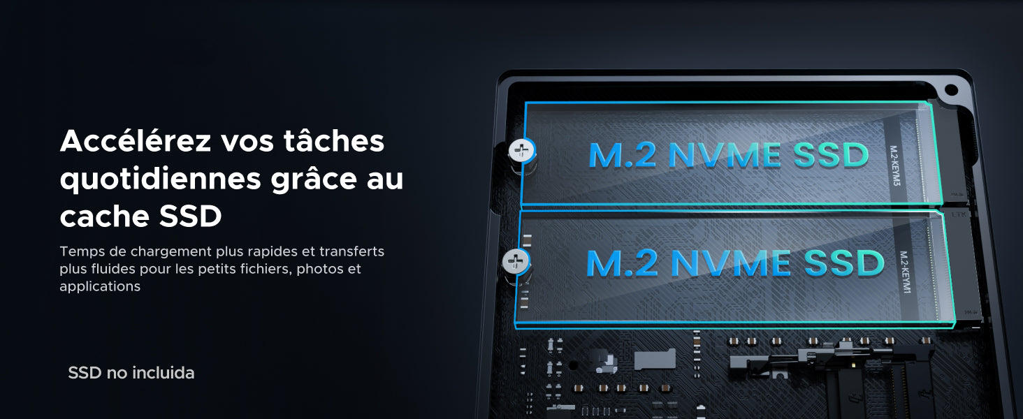 - Deux emplacements SSD M.2 NVMe : Le cache SSD utilise les IOPS extrêmement élevées pour accélérer les opérations de lecture et d'écriture du disque dur – en particulier pour l'accès aux petits fichiers.