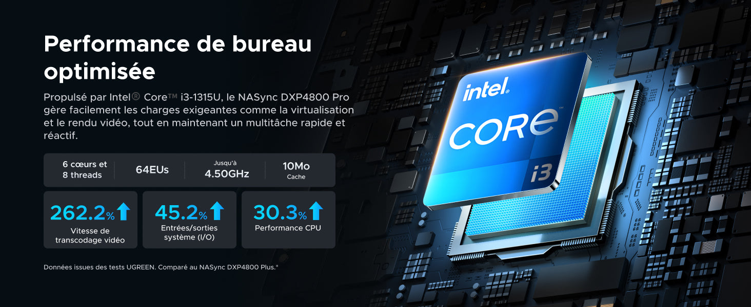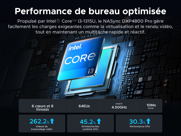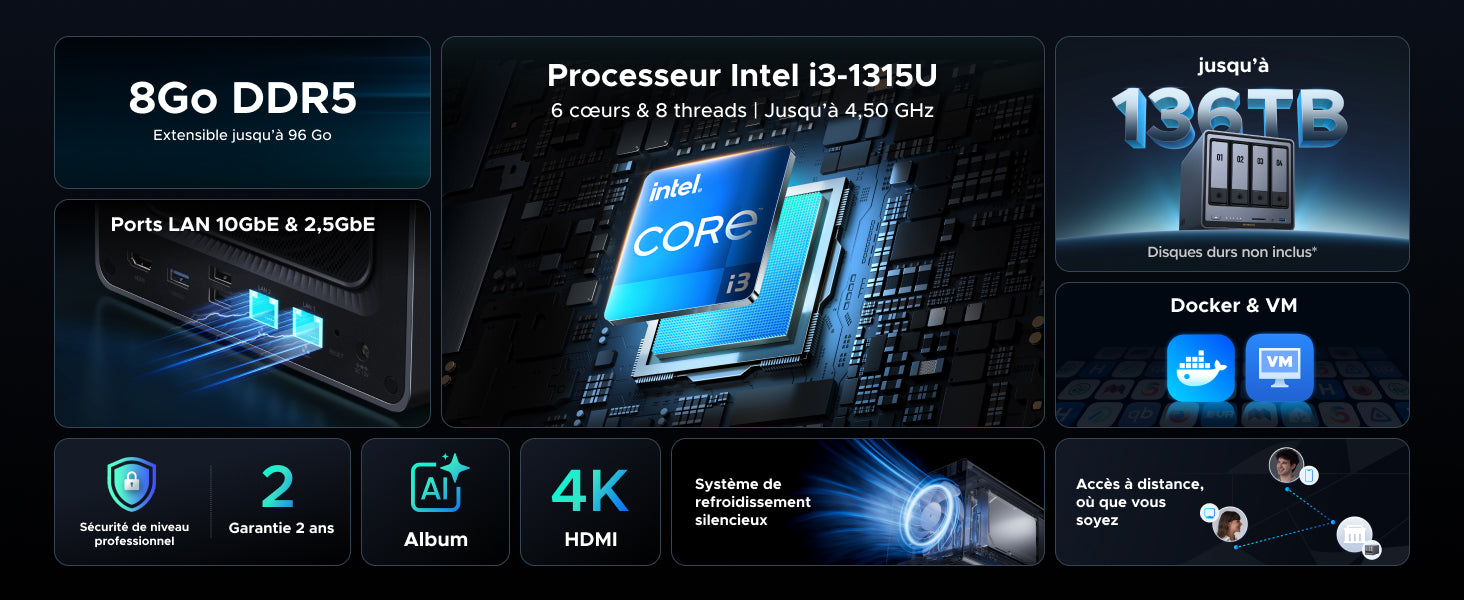 - Processeur Intel Core i3-1315U : 6 cœurs, 8 threads, jusqu'à 4,5 GHz en mode Turbo. Offre une marge de performance supérieure aux NAS d'entrée de gamme pour un multitâche plus fluide et des charges de travail plus exigeantes.
