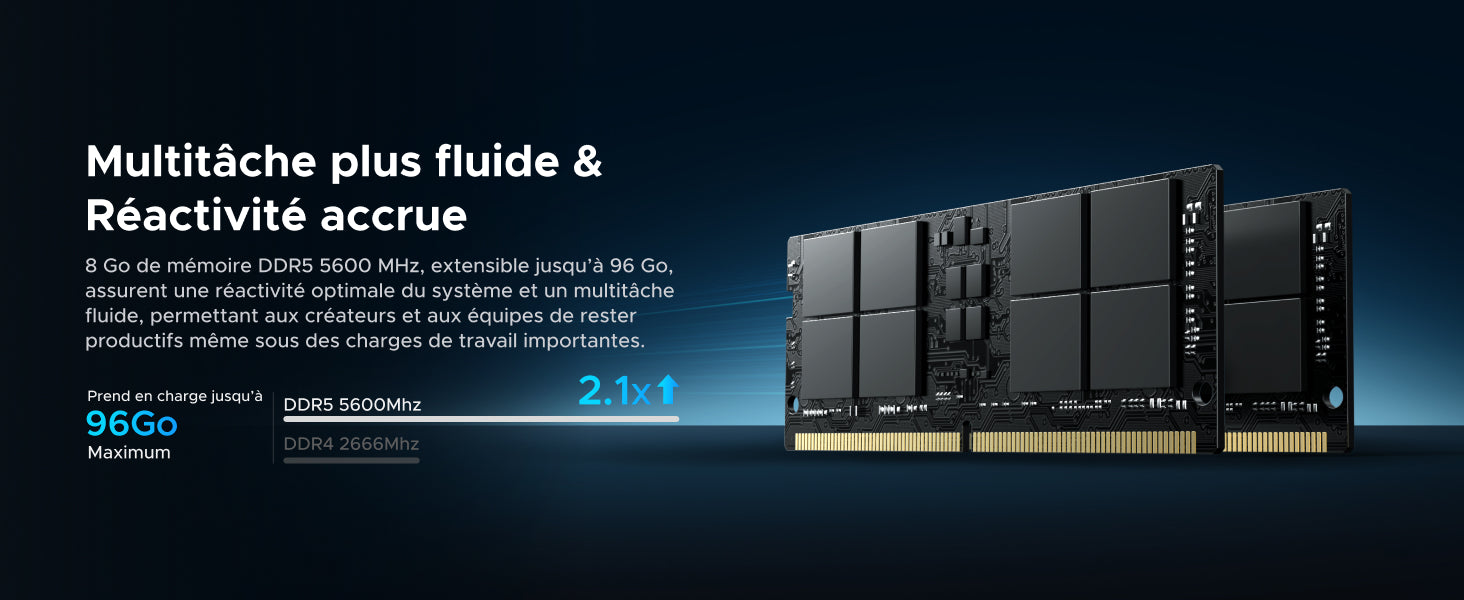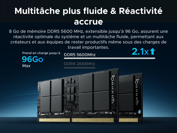 - 8 Go de RAM DDR5-5600 (extensible à 96 Go) : Bande passante mémoire plus élevée que les systèmes DDR4 pour une réactivité système nettement plus rapide, des performances d'application plus fluides et un traitement de fichiers accéléré.