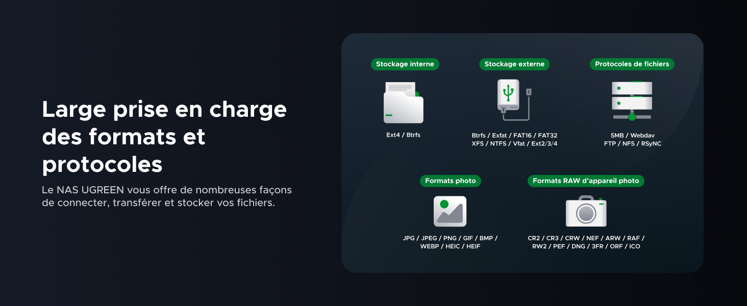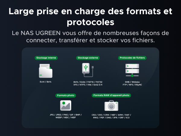 - Le UGREEN NASync est parfaitement compatible avec les disques durs de différents fabricants tels que Western Digital, Seagate, Toshiba et bien d'autres. Pour plus de détails, veuillez consulter notre liste de compatibilité .