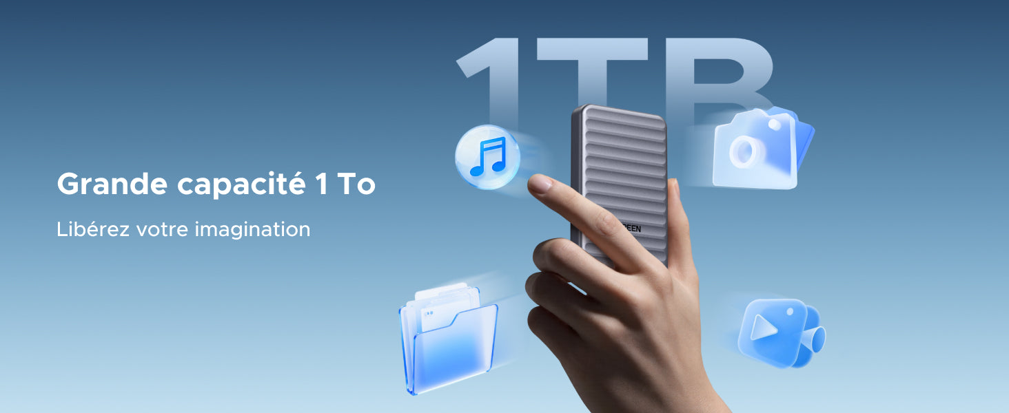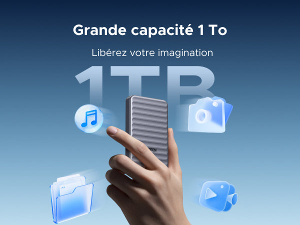 - La capacité dont vous avez besoin : 1 To d'espace de stockage pour environ 600+ vidéos 4K (1,5 Go), 30 000+ titres audio sans perte (30 Mo), 20+ jeux (50 Go) ou 330 000+ photos HD (3 Mo).