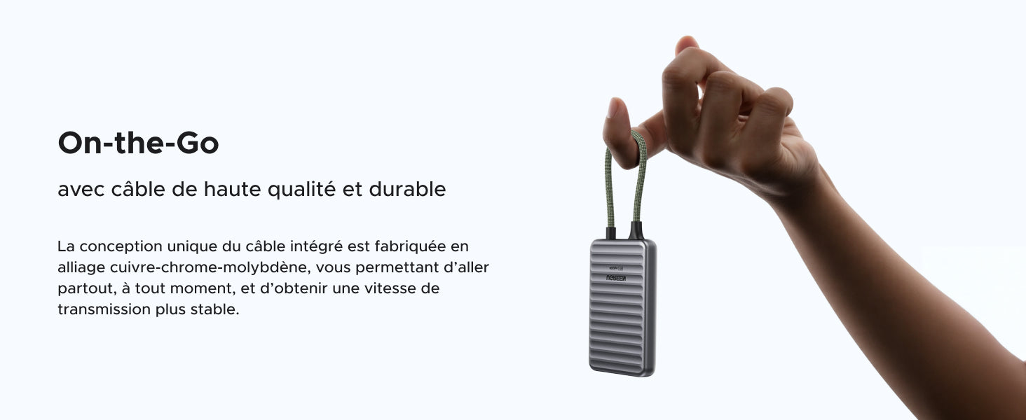 - SSD externe avec câble intégré : Premier disque externe au monde avec câble intégré. Plus besoin de chercher un câble en déplacement – il suffit de l'attacher et c'est parti. Câble Type-C ultra-résistant avec un tressage unique.