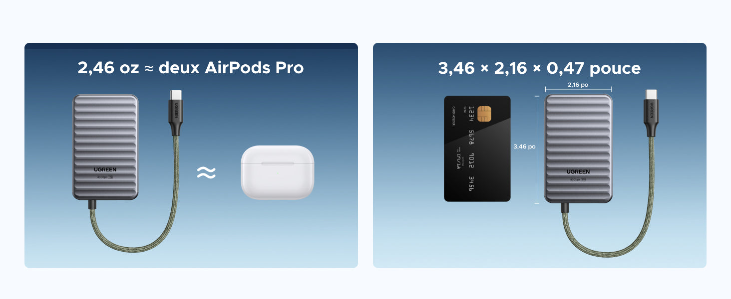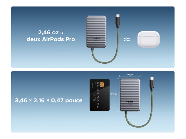 - Léger & compact : Aussi léger qu'une paire d'AirPods, aussi petit qu'une carte de crédit. Se glisse dans toutes les poches – parfait pour les trajets quotidiens et les voyages.