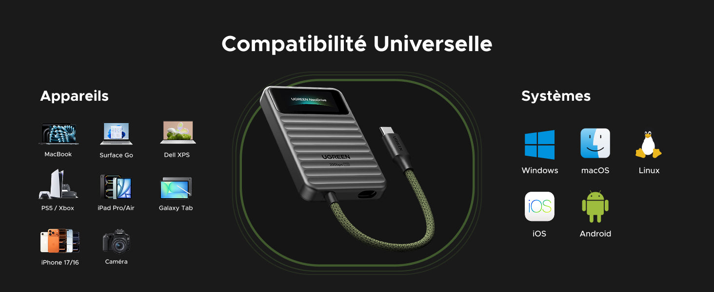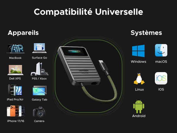 - Compatibilité système : Fonctionne avec PC (Windows/macOS/Linux) et smartphones/tablettes (iOS/iPadOS/Android, jusqu'à 10 Gbit/s).