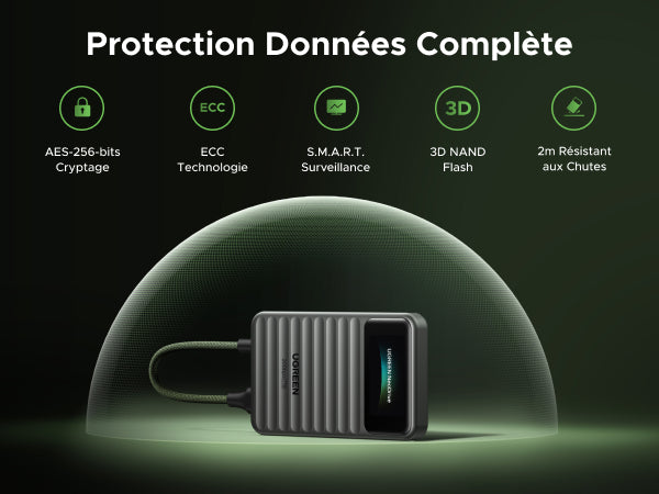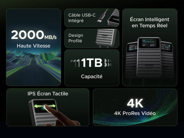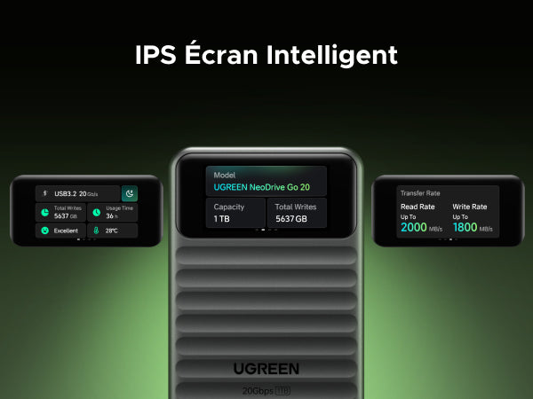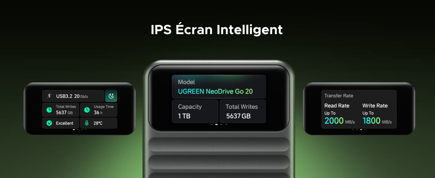 - Écran intelligent de 3,7 cm : L'écran IPS couleur affiche en temps réel la vitesse, la température et l'état du disque – toutes les infos d'un seul coup d'œil.