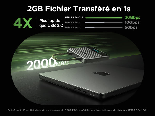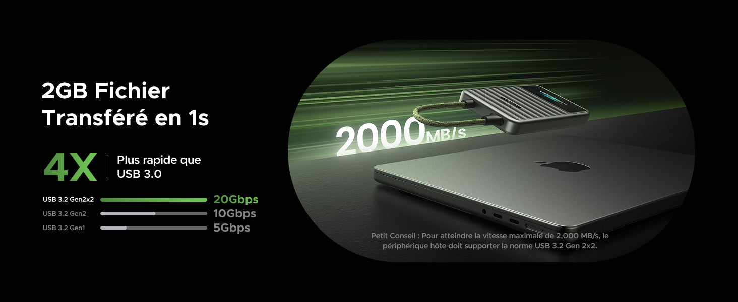 - Transfert haute vitesse 20 Gbit/s : Mémoire 3D NAND et gestion thermique optimisée. L'interface USB 3.2 Gen 2x2 offre des vitesses stables jusqu'à 2000 Mo/s.
