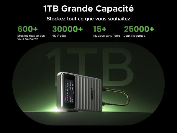 20 Gbit/s – Transfert haute vitesse | 1 To de capacité | Câble intégré & fixation magnétique | Écran intelligent