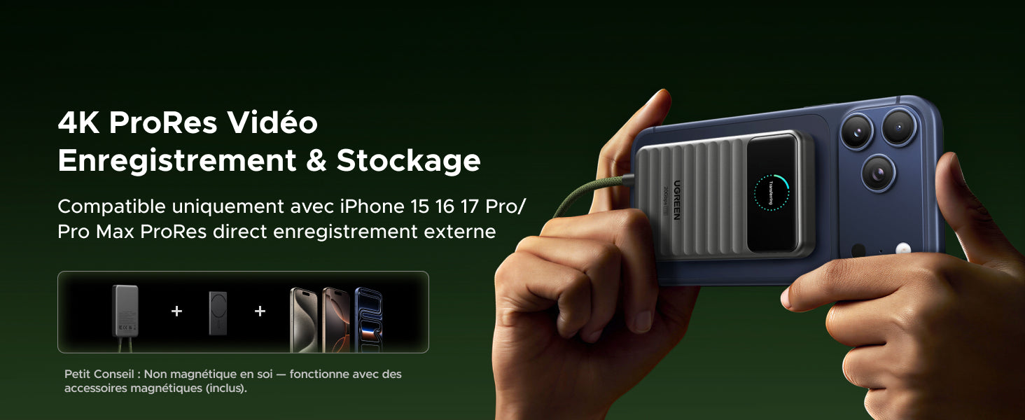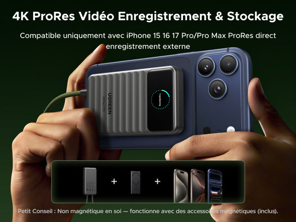 - Enregistrement 4K ProRes : Compatible avec iPhone 15/16/17 Pro & Pro Max. Enregistre les vidéos 4K ProRes directement sur le SSD – sans perte, préserve l'espace de l'iPhone.